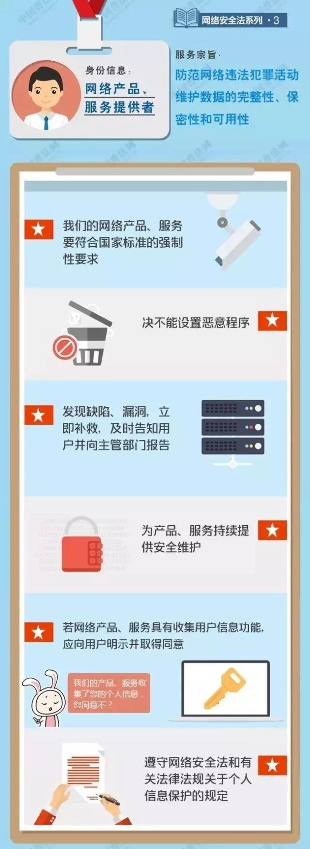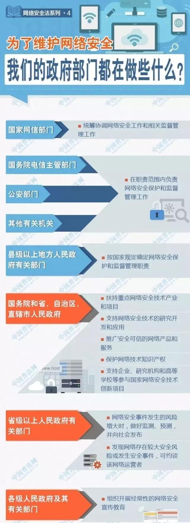 《中华人民共和国网络安全法》明确了部门、企业、社会组织和个人的权利、义务和责任。规定了国家网络安全工作的基本原则、主要任务和重大指导思想、理念。将成熟的政策规定和措施上升为法律,为政府部门的工作提供了法律依据,体现了依法行政、依法治国要求。