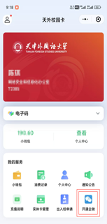 第一步,进入微信‘天外校园卡’小程序,点击右下角应用——‘开通企微’按钮(下图左)
