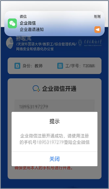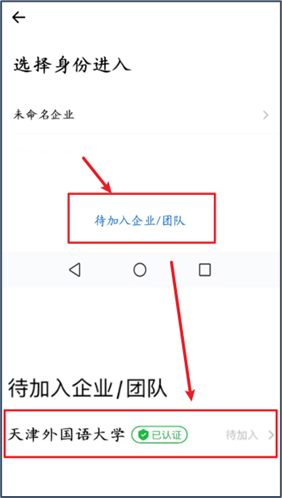 注:如企业微信提示“选择身份进入”,请点击“待加入企业/团队”选择“天津外国语大学”已认证,点击进入学校官方企业微信。不要加入“未命名企业”。